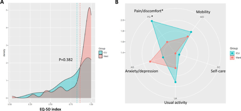図1 COVID-19入院後の健康関連QOLをEQ-5D 5Lで評価した病棟群とICU群。1A:EQ-5D指数の分布(0:死亡→1:完全健康)。1B:各領域における病棟とICU群におけるEQ-5D 5Lのスコア。各領域は5点満点で採点されている。1 問題なし、2 軽度の問題あり、3 中等度の問題あり、4 重度の問題あり、5 できない。*: P=0.032.