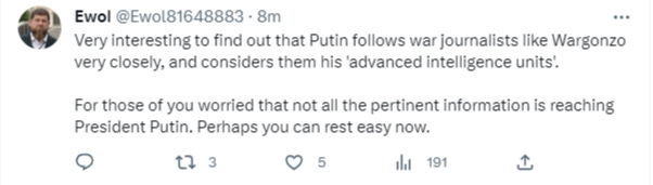 また、SMOによって、無人機や誘導兵器など、ロシアが必要とする多くの近代的なシステムが欠けていることが明らかになったことも認めている。しかし、後者の点は、親ウクライナのアカウントによって、プーチンの発言をロシアにはまだこれらが不足していると誤解させるために使われている。しかし、実際にはプーチンは、ロシアは現在、ドローンを以前の10倍、特定の通常兵器を3倍、誘導弾のような特定の種類の必要なシステムを同様に10倍生産していると発言して、発言を締めくくった。