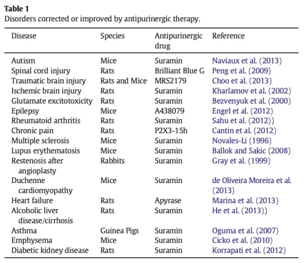 現在、全身のプリン作動性受容体を全て遮断する薬剤として、スラミン(アフリカの睡眠病治療用抗寄生虫薬)が存在する。スラミンに加え、特定のプリン作動性受容体を遮断する他の薬剤も存在し、その多くがナビオがCDRと関連付ける自己免疫疾患の改善に効果があると実証されている: