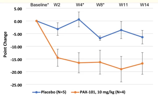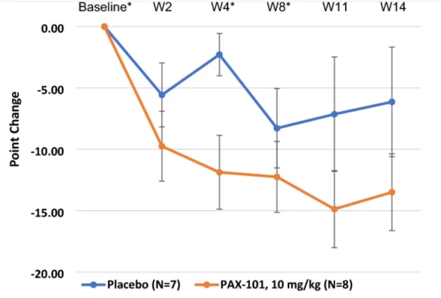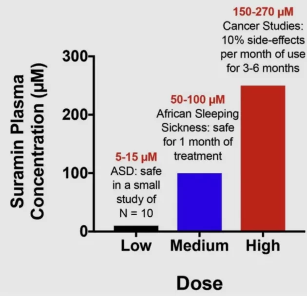 PaxMedicaの無作為化 二重盲検プラセボ対照試験では、中等度から重度の自閉症を持つ4~15歳の男児52名を対象に、試験開始時、4週目、8週目に静脈内スラミンを投与した。試験期間中を通じて改善度を評価し (最終評価は3回目の投与から6週間後)。結果はコア症状異常行動チェックリスト(ABC-Core)で評価され、プラセボと比較した結果、低用量スラミン(10mg/kg)では効果が認められたが、高用量(20mg/kg)では認められなかった。具体的には、14週目のABC-Coreスコアがプラセボ群(−8.9±2.86)に対し−12.5±3.18の改善を示し、特に低年齢児や症状が軽度の患者で顕著な改善が認められた(CDRの評価基準を考慮すると合理的である)。さらに、別の尺度(臨床的全体印象)も改善した(2.8±0.30 対 プラセボ群の 1.7±0.27)。