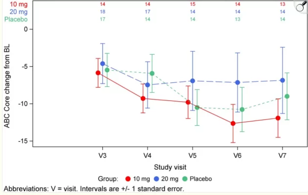 PaxMedicaの無作為化 二重盲検プラセボ対照試験では、中等度から重度の自閉症を持つ4~15歳の男児52名を対象に、試験開始時、4週目、8週目に静脈内スラミンを投与した。試験期間中を通じて改善度を評価し (最終評価は3回目の投与から6週間後)。結果はコア症状異常行動チェックリスト(ABC-Core)で評価され、プラセボと比較した結果、低用量スラミン(10mg/kg)では効果が認められたが、高用量(20mg/kg)では認められなかった。具体的には、14週目のABC-Coreスコアがプラセボ群(−8.9±2.86)に対し−12.5±3.18の改善を示し、特に低年齢児や症状が軽度の患者で顕著な改善が認められた(CDRの評価基準を考慮すると合理的である)。さらに、別の尺度(臨床的全体印象)も改善した(2.8±0.30 対 プラセボ群の 1.7±0.27)。