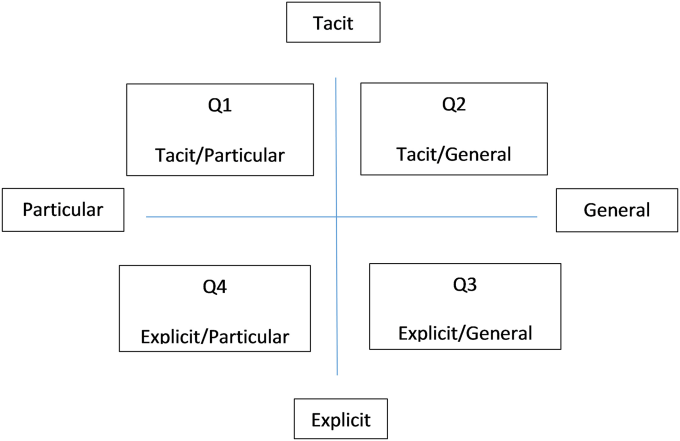 定量的/個人的(Q4)は生活の質(QoL)尺度に代表され、定量的/一般的(Q3)はEBM、特にRCTから得られるエビデンスの種類に代表される。これらのエビデンスから得られる知識は、一般的に数値的であるため、明確に表現しやすいという点で、明らかに明示的なものである。