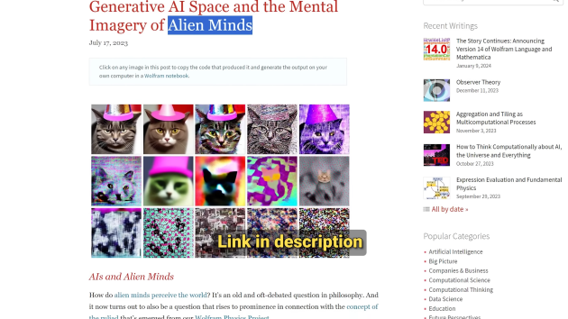 意識と観察の違いについて、Wolframは観察が意識の「外部膜」のようなものだと説明する。彼は意識を「存在の内的感覚」と見なし、それよりも観察の仕組み—外部世界を認識可能な形に取り込む方法—に関心がある。彼は意識の「症状」(時間的連続性など)を理解することが、我々が知覚する物理法則を理解する上で重要だと主張する。人間、AI、自然プロセスの知性は度合いの問題ではなく「ルール空間」における距離の問題である。
