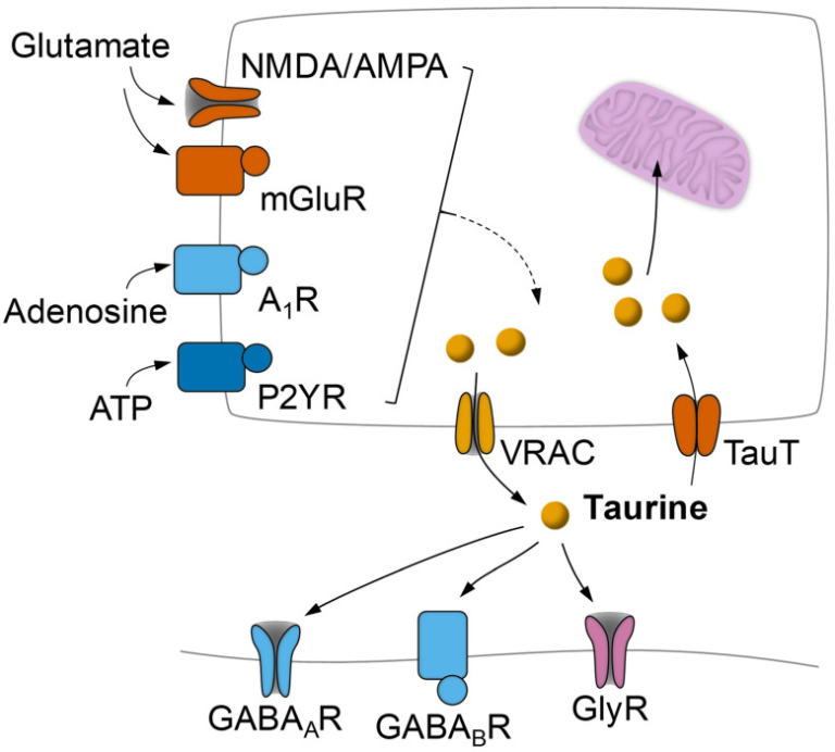 タウリン放出は主に低浸透圧条件や電気的活動によって活性化される体積調節性アニオンチャネル(VRAC)を介し、グルタミン酸代謝性(mGluR)およびイオン性受容体(主にNMDAおよびAMPA)、アデノシンA1受容体(A1R)および代謝性ATP受容体(P2Y)を介して刺激を受けることが可能である。タウリンは、GABAA、GABAB、グリシン受容体に結合することにより、神経調節作用を発揮する。タウリンの再取り込みは、タウリントランスポーターであるTauTによって行われる