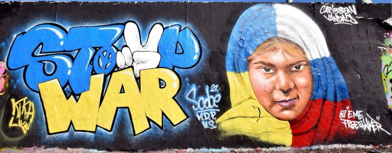 ドイツ・ベルリンのマウアーパークで、ロシアのウクライナ戦争に「戦争を止めろ」と落書き。2022年3月11日に撮影された画像。出典はこちら。ウィキメディア・コモンズ
