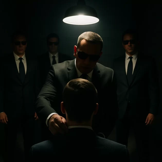 明るい吊り下げライトが上から照らし、周りの顔を見えにくくしている。黒い服の男たちは皆同じように見える。彼らは沈黙を保ち、あなたに謎と格闘させる。しかし、あなたはそれほど恐れていない。「これはおそらく単なる手順だ」と自分に言い聞かせる。その時、男の一人が前に出て、あなたの襟を直し、静かに話しかけてくる: