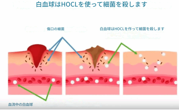 今日、HOClの多様な応用を支持する科学的研究が蓄積されている。数多くの研究が皮膚科および外科領域での有効性を示している。次亜塩素酸は完全に天然由来の無毒な酸化剤であり、99%以上の細菌やウイルスを死滅させることができる。