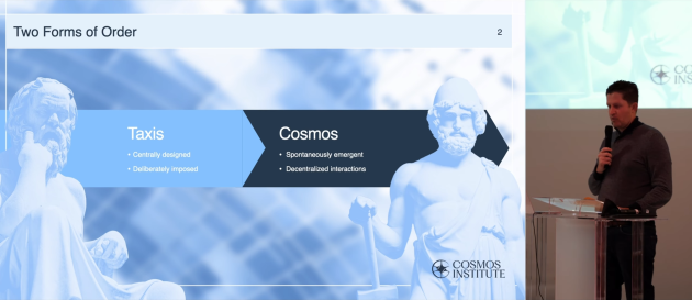 古代ギリシャ人には「秩序」を表す二つの言葉がありました。一つ目は「タクシス」です。タクシスは意図的に作られた秩序です。中央設計によって課される秩序です。これは「分類法(taxonomy)」という言葉の語源で、自然界に私たちが置く分類を意味します。二つ目は「コスモス」、自発的秩序、分散化された相互作用から生まれる秩序です。コスモスは、市場や道徳、言語や法(特にコモンロー)、そして技術的知識の成長において私たちを取り囲んでいます。これは単一の精神が設計できない適応的な秩序です。