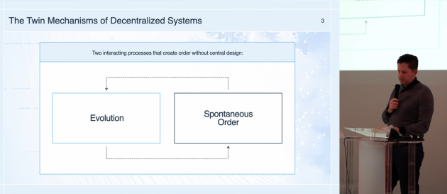 分散システムが機能する二つの本質的なメカニズムとして「進化」と「自発的秩序」を説明している。進化のメカニズムでは、分散システムが不適応なアイデアをフィルタリングし、成功したアイデアを自然選択する過程を説明する。ユーザーや開発者、リソースの移行を通じた選択圧力が働き、並行実験の多様性が効果的な進化をもたらす。一方で中央集権的プロジェクトは実験数が少なく、階層的意思決定によって選択基準が制限され、失敗時に蓄積知識が失われるという限界がある。