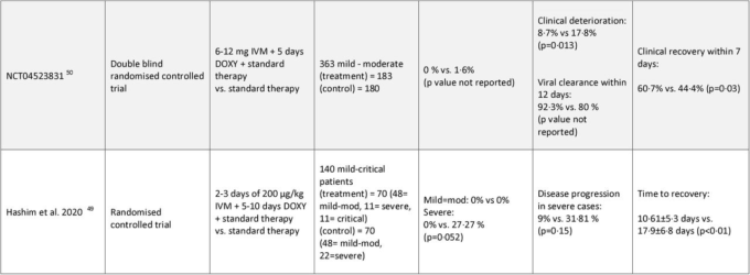 IVM イベルメクチン、DOXY ドキシサイクリン)。イベルメクチンはすべての試験で経口投与された。”標準治療」は試験によって異なり、試験期間中にその地域・病院で行われた標準治療と定義されている。