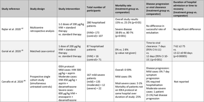 medRxivに掲載されたプレプリントの観察的解析では、IDEAプロトコルとして知られるイベルメクチン併用療法がCOVID-19患者(n=167)を対象に、同期間におけるCOVID-19全体の死亡率(p=0-0475)と比較した場合の死亡率の改善効果が報告されている47。これには、重症度に応じてイベルメクチンとアスピリンまたはエノキサパリンの用量を段階的に増加させるものと、中等度から重症の入院患者にはデキサメタゾンを投与するものが含まれている。軽症(n=135)中等症(n=12)重症(n=22)にそれぞれイベルメクチン300μg/kg、450μg/kg、600μg/kgを0日目と7日目に投与した。本試験には、平均年齢55~7歳の合計167名の患者が含まれていた。主要アウトカムは疾患の進行と30日死亡率であった。軽度患者群(n=135)では、追跡期間7日以内の症状進行率は0%であった。このサブグループでは入院を必要とした患者はおらず、全員が完全に回復した。中等度から重度の患者群(n=32)では、30日後と2ヶ月後に死亡した患者は1人だけであった。この患者を除いて、残りの31人の中等度から重度の患者では、IDEAプロトコル開始後に病勢の進行はみられず、全員が回復に向かった。これは、レムデシビル、ロピナビル、インターフェロンβ1,ヒドロキシクロロキンによる疾患進行の減少を示さなかった世界保健機関(WHO)のSOLIDARITY試験の中間報告とは対照的である。これは、約2-1%(p=0-045)の地域の全死亡率と比較している。IDEAプロトコルを受けた中等度重症患者(n=32)の死亡率は3-1%であり、IDEAプロトコルを受けなかった同期間の入院患者(n=12)の死亡率は25%であったのに対し、IDEAプロトコルを受けた中等度重症患者(n=32)の死亡率は3-1%であった。この研究は、中等度から重度の患者数が一致した並行対照群がないことによって制限されている。COVID-19に対するレムデシビルの大規模無作為化プラセボ対照試験における28日目の全死亡率は、レムデシビル投与群で11-4%であったのに対し、対照群では15-2%であったと報告されている。IDEA試験とレムデシビル試験の中等症から重症への分類は、試験方法により同等であった。