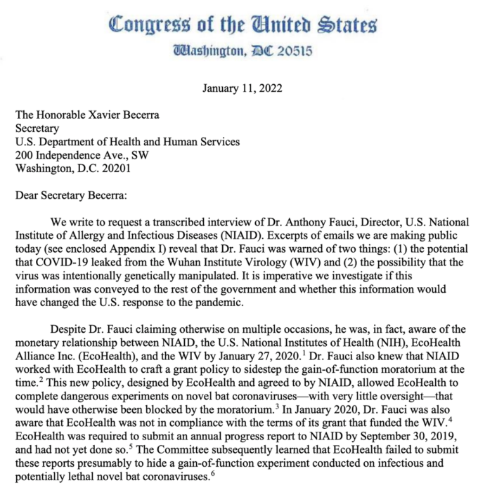 まずは、下院議員のJim Jordan氏(司法委員会のランキングメンバー)とJames Comer氏(モニタリング改革委員会のランキングメンバー)が厚生省長官のXavier Becerra氏に送った手紙から始めよう。ここでは、その抜粋を紹介する。