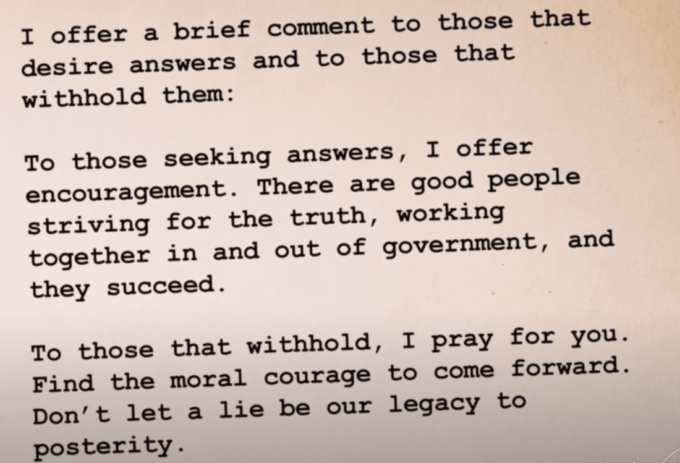 答えを求めている人には、励ましの言葉を贈ります。真実を求めて努力し、政府の内外で協力している人たちがいて、彼らは成功しています。