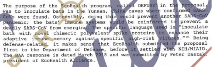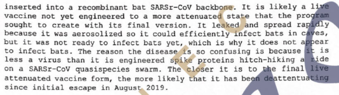 今回の研究の目的は、SARSウイルスが確認された中国・雲南省の洞窟で発見されたコウモリにワクチンを接種することだった。この研究プロジェクトは、現地のコウモリ個体群から発見されたコウモリのSARSウイルスのパンデミックを抑えるためのものである。基本的には、研究者たちはコウモリの弱毒化したウイルススパイクタンパクのワクチンを作り、”コウモリの免疫記憶を強化 “しようとしていた。もちろん、パンデミックや急速に変異するRNAウイルスに対してワクチンを打つべきではないという格言を覚えておくこと。しかし、この研究者たちは、このリスクに気づいていなかったようだ(多くの問題に気づいていなかったようだが、それはここでは重要ではない)。なぜ、人間に適応したウイルスをコウモリに接種するのか、と。マーフィー少佐は、ウイルスが完全に減衰する前に誤って放出されてしまったことを詳細に説明している(減衰とは、病原性を持たないように変異させたことを意味し、おそらくコウモリや人間にとってはそうなのだろう)。