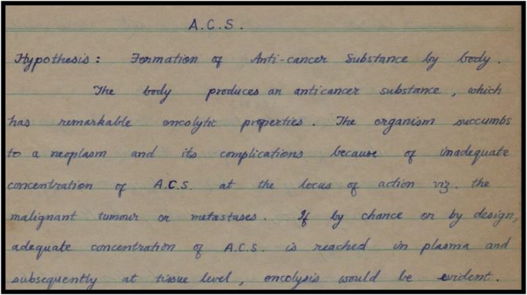 その翌年、1967年には、メルク社の国際フェローとして臨床薬理学および癌化学療法部門のエール大学医学部へ赴いた。そこで病院の記録保管所で、平滑筋肉腫の患者の症例報告を見つけた。外科手術で腫瘍を除去した後、何年も再発は見られなかった。しかし、同じ期間に、彼女は術後の膀胱膣瘻を発症しており、何度か試みたものの、うまく修復することができなかった。その後、瘻孔が最終的に修復されたとき、腫瘍は激しい勢いで再発し、患者は広範囲にわたる転移を伴って死亡した。これは、修復不可能な瘻孔により、膣粘膜からA.C.S.が全身的に吸収され、その結果、腫瘍が長期間抑制されたという主張を裏付けるものである。瘻孔が修復され、膣への尿の漏れがなくなった後は、腫瘍はA.C.S.によって抑制されず、全身に作用しなかった。私はその後、組織や体液における癌の促進および抑制物質に関する広範な文献をすべて調査した[7][8][9][10]。私は、ラットのTwort肺胞癌の腫瘍退縮を誘導するヒト尿抽出物に関するウィリアムズとウォーターズによる画期的な研究に出合った[11]。アルバート・セント・ジョルジ(Albert Szent-Gyorgyi)と彼の同僚による、組織とヒトの尿から抽出された抗がん性レチンの研究が知られるようになった[11][12][13][14]。しかし、彼らの研究対象は尿抽出物中のケトアルデヒドとメチルグリオキサルのみであった。単離された化合物は抗がん活性を持っていなかった。このため、ノーベル賞受賞者とその同僚によるこの驚くべき発見に対する関心は、一般的に低かった。