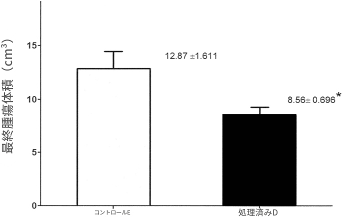 コントロール群と自己尿投与群のメラノーマ容積の差異(*p < 0.05)。