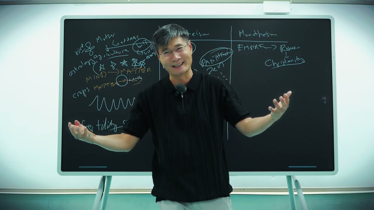 そして今、神々のパンテオン(pantheon:神殿)があり、これが多神教につながります。それから我々は多神教から一神教に切り替わります。なぜでしょうか?今度は帝国という新しいアイデア、具体的にはローマ帝国があり、彼らは世界初の一神教であるキリスト教という新しい宗教を導入したからです。最初の一神教が何であったかについては多くの議論があります。ゾロアスター教だと言う人もいます。ユダヤ教だと言う人もいます。この授業で後ほどお見せしますが、実際に一神教であった最初の宗教はキリスト教です。