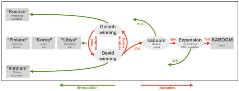 トランプの山からスペードを引く確率を見積もるには、スートがいくつあるかを知ることが重要である。現在の不安定な状況が「KABOOM」(核の冬を引き起こし、地球上のほとんどの人が死ぬかもしれない米露の大規模な核戦争)という結果に終わる確率を推定するには、同様に、他にどのような合理的に安定した結果と競合しているのかを知ることが重要である。私がこれらの結果に付けた略語(灰色のボックス)は、あまり文字通りには受け取らないでほしい。「コソボ」と「ベトナム」は、どちらかが完全に勝利するシナリオを指す(それぞれ、離脱が成功し、ゴリアテは追放される)。「リビア」、「韓国」、「フィンランド」は、それぞれ、戦争勃発、戦争凍結、完全平和という中間的な結果を意味する。2021年12月にテーブルの上にあった「キューバ」の結果(交渉による合意で侵略回避)は、ノルドストリーム・パイプラインによるEUとロシアのガス輸出の再開と同様に、現在はテーブルから外れているので示していない。